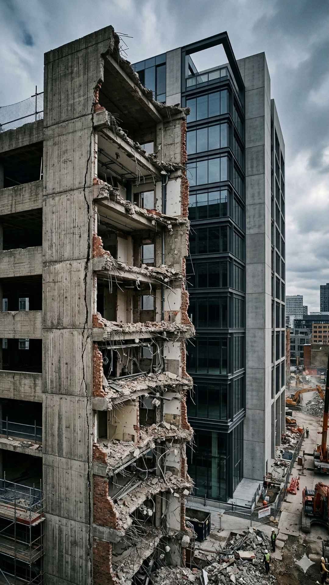Сложный городской снос коммерческих зданий в условиях плотной застройки, требующий снижения вибрации и контроля пыли.